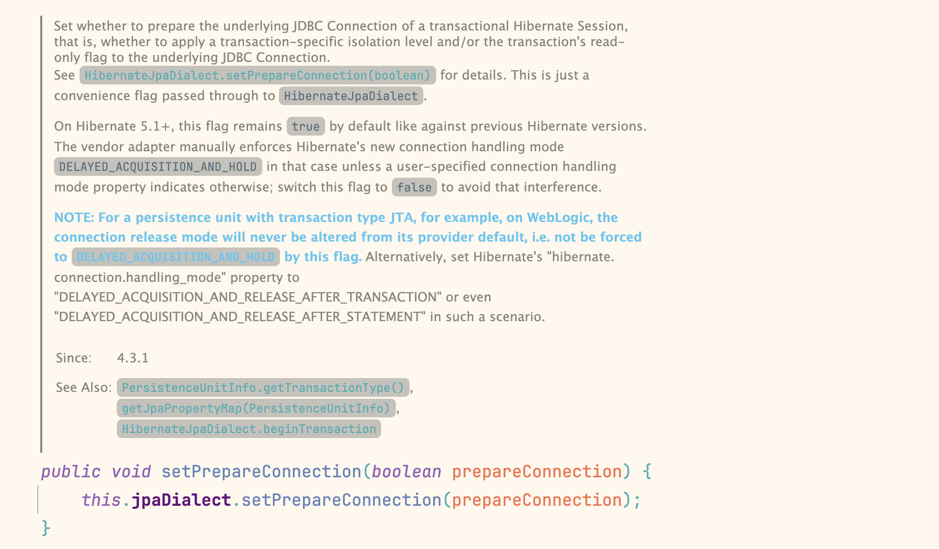 @Override public Map<String, Object> getJpaPropertyMap(PersistenceUnitInfo pui) { return buildJpaPropertyMap(this.jpaDialect.prepareConnection && // 1번 ✅ pui.getTransactionType() != PersistenceUnitTransactionType.JTA); } @Override public Map<String, Object> getJpaPropertyMap() { return buildJpaPropertyMap(this.jpaDialect.prepareConnection); // 1번 ✅ } private Map<String, Object> buildJpaPropertyMap(boolean connectionReleaseOnClose) { Map<String, Object> jpaProperties = new HashMap<>(); // ... 다른 설정들 jpaProperties.put() if (connectionReleaseOnClose) { jpaProperties.put(AvailableSettings.CONNECTION_HANDLING, PhysicalConnectionHandlingMode.DELAYED_ACQUISITION_AND_HOLD); // 2번 ✅ } // For SpringBeanContainer to be called on Hibernate 6.2 jpaProperties.put("hibernate.cdi.extensions", "true"); return jpaProperties; }1. 1번 ✅ 에서 prepareConnection = true 로 인자가 넘어간다.